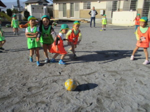 2023年12月8日 季節の英語 今日はハローわくわくがありました。 「クリスマスツリー!!」 季節の英語を使って遊びました(^o^) ♪クリスマスツリー レインディア ベル~🔔 の曲に合わせて踊って楽しめました。 園庭では巨大みのむし!?(^O^) 大きなみのむしがくっついたもんだ、、 枝さんがんばれ、、、 ももさんは園庭の落ち葉を集めて葉っぱプール! クシャクシャ ふわふわ 面白いね~☺ ゆっくり自然物遊ぶが出来て嬉しいな! 午後からみどりさんはサッカー教室がありました。 「むねっちせんせい」に元気よくご挨拶して一緒に体を動かします! ラダー運動や ボールキャッチ 基本的なことから自分で挑戦(^^)/ お友達とガンバレーと励まし合いながら サッカーの試合ができました。 スポーツは体だけでなく心と心のぶつかり合いだね~(^^)/ 貴重な体験をありがとうございました。 Tweet Share