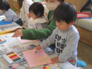 2024年1月15日 お絵かきあそび☆ 今日は支援室でお絵かきあそびをしました。 画用紙にペンやクレパスでお絵かきをしたものを ひもで閉じて、お絵かきブックにしました✨ ぐるぐるぐると、優しい線や力強い線が描けたね。 お顔を描いているお友達もいたよ😊 大きな紙に絵の具でお絵かきをしました。 グルグル…と大きく描けるお友達、 点々…と細かく描くお友達、 線を描くお友達、 みんな、た~くさんお絵かき出来たね☺ 素敵なお絵かきブックができあがりました☆ 本日もご参加いただきまして、 ありがとうございました。 また遊びに来てくださいね♡ Tweet Share