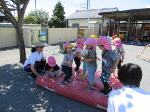 2024年6月3日 体育あそびがあったよ 今日は体育遊びがありました。 マット・跳び箱を使って体を動かして遊べました。 どうしたら跳び越せる?? 難しいと感じることにも挑戦できるってかっこいいね! お天気が良いので園庭でたくさん遊べました。 砂場で川作り~ サンビレッジのお姉さん方が遊びに来てもらえました。 遊んでもらって嬉しかったね(^_^)/ 園庭のビオラで色水遊び。 新聞紙をたくさん破りました。 ここからどうなる? 何かとつながっていく遊び、楽しみがいっぱいだ! 今しか出来ない遊びが たくさん楽しめると嬉しいな(^o^) Tweet Share
