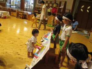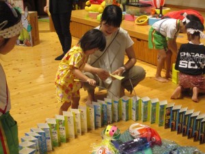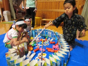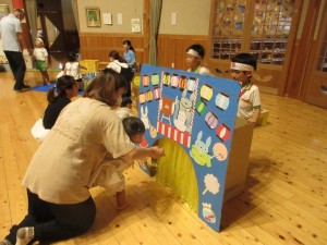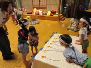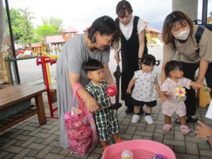2024年8月30日 アーシャ夏祭り 今日は支援室の夏祭りがありました。 最初に、アーシャのおともだちと こども園のおともだちで盆踊りをしました。 盆踊り後は、ゲームタイム✨ 《お魚つり》 どのお魚にしようかな… かわいいお魚がつれたよ~🐟 お魚つれるといいね♡ みどり組のおともだちが、応援しているよ‼ みどり組のおともだちがゲームのお手伝いを してもらえました。 《輪投げ》 《ボーリング》 《ボール投げ》 4つのゲームを楽しめたら、 どれにしようかな? 好きなメダルを選んだよ(*^_^*) 最後は、お玉でヨーヨー風船をすくったよ。 みんな、上手にすくえたかな? 本日はお足元の悪い中でしたが、 たくさんのおともだちが あそびに来てもらえました。 ありがとうございました。 Tweet Share