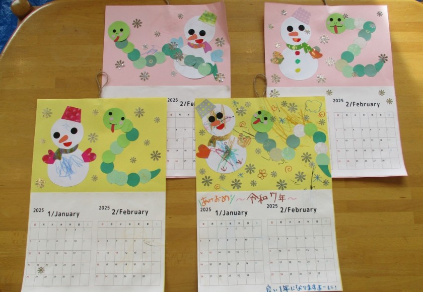 2024年12月20日 1・2月のカレンダー作り☆ 今日は支援室で1・2月のカレンダー作りをしました。 来年の干支ヘビ🐍と雪だるま⛄を製作しました。 ヘビは、丸紙にのりをつけて繋げて貼り、 シール貼りやペンでお顔を作ったよ。 雪だるまは、クレパスでお絵かきをして 手袋やマフラーをつけて飾ったよ。 みんなの素敵なカレンダーが 出来上がりました✨✨ お家に飾ってくださいね♡ 本日もご参加頂きまして ありがとうございました。 またあそびに来てくださいね。 Tweet Share