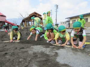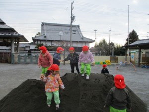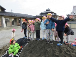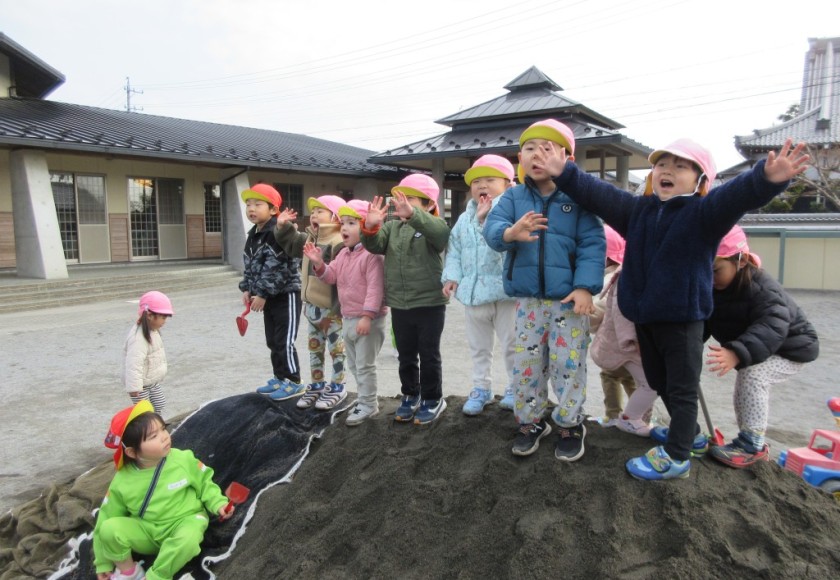 2025年2月27日 お山に向かって『やっほー!!!』 もりもり食べよう 木曜日🍴 昨日業者の方が新しい砂を補充しに来て下さいました。 みんな園庭の砂のお山に大興奮!!! 池田山に向かって大きな声で『ヤッホー!!!』 みんなの声は届いたかな!? 自分の背よりも大きなお山に興味津々で 『タタタタ…!!!』と駆け上がったり 記念に手形を残して楽しむ姿もありました🎵 登るだけでなく砂に触れてサラサラした感触を楽しんだり、 上からの景色を見て喜ぶ子もいたりと それぞれの楽しみ方がありました✨ ローラーのようにして息を合わせて『シュー!!!』 デコボコだったお山の砂が真っすぐになって 綺麗になったね☆ まだお山が残っているから明日も楽しもうね♡ Tweet Share