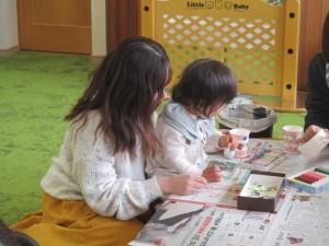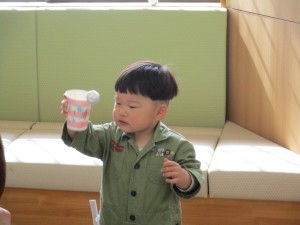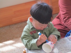 2025年3月14日 手作りおもちゃ 今日は支援室で手作りおもちゃを作りました。 お母さんと一緒に新聞紙を丸め、 その上にアルミホイルをかぶせて玉にして けん玉を作りました。 ころころと転がる紙コップを押さえて お絵かきしたり、シールを貼ったりしました。 けん玉の紙コップを振って 玉が動くのを見たり、 紙コップの中で音がするのを聞いたりして あそびました。 本日もご参加いただきまして ありがとうございました。 また遊びにきてくださいね。 Tweet Share