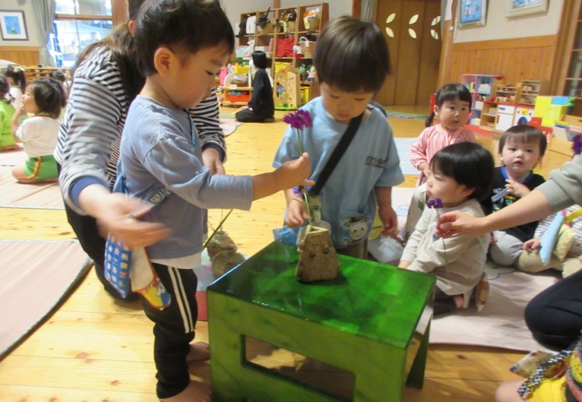 2025年4月22日 花まつりがあったよ🌼 今日は花まつり💐 花を活けて お釈迦さまの誕生をお祝いします✨️ お家からお花を持ってきていただいた お友達もたくさんいたよ🏵️ ご用意ありがとうございました。 副園長先生から「ありがとう」の 優しい気持ちを持とうねと お話がありました✨️ お釈迦さまがお生まれになったとき 甘い雨が振りました💧 それにちなんで、 甘茶をお釈迦さまにかけました そろ~り、優しくかけたよ みどりさんが作った 「花御堂」と一緒に写真をとったよ📷️✨️ 花まつりのあとは、 園庭あそびを楽しんだよ(*^^*) Tweet Share