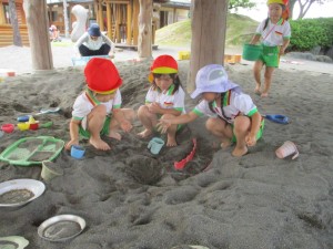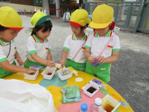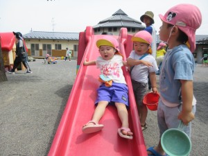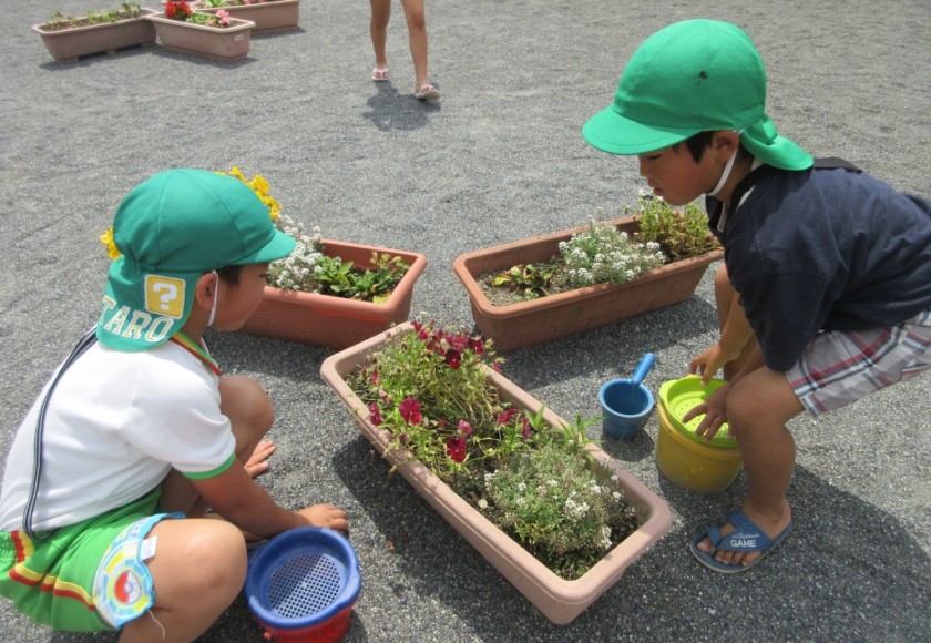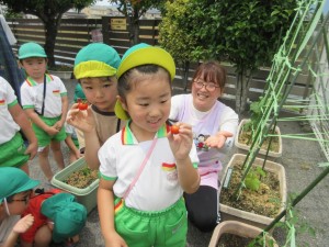 2025年6月9日 お外で元気に遊んだよ☆ 今日も、こども園のお友達は元気いっぱい! 園庭でたくさん遊べました(^^) みどりさん パンジーの根本に『ツマグロヒョウモン』の 幼虫がたくさんついていました。 「どんなちょうちょになる?」 「さなぎは動かないね~」などと お友達同士でお話しながら見つけたよ! 遊んだ後は、そっと逃がしてあげれる 優しさがあって嬉しかったです♡ プランターのミニトマトが赤くなったよ!! 「ピカピカできれい✨」とニッコリ のの様にお供えしてみんなで頂こうね♡ きいさん 和紙の染め物遊びをしたよ。 どんな色に染まったかな?? 「黒豆の紫色」が人気のようです☆ あかさん 裸足で砂場の中に入ると(^▽^)/ ちょっぴりひんやりして気持ちいいね(^▽^)/ ももさん 順番にすべり台をするよ。 「シュー」っと何度も滑って楽しんだね。 Tweet Share