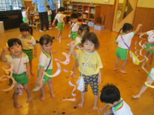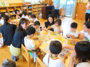 2025年6月25日 保育参観があったよ! スイスイ走ろうすいようび 今日は保育参観があったよ お家の人が、こども園での様子を 見に来てもらったね みどりさんは、きれいな声の歌を お家の人に聞いてもらえたよ 歌を歌う楽しい気持ちがお家の人に伝わったね♪ その後は、新聞でカバン作りをしたよ💼 一緒に飾りつけをして、 自分だけのカバンができて嬉しいね きさんは、七夕製作を一緒にしたよ✰ 織姫様と彦星様の顔を作ったね クレヨンで顔と髪の毛を描いて 彦星様には帽子をつけて、 織姫様には丸いおだんご結びをつけたら、 かわいい七夕飾りの完成!🎋 あかさんは、くるくる回る8の字風車を作ったよ 怪我をしないようにお家の人と ハサミでチョキチョキ✂ 模様をつけて、割り箸につけたら完成! くるくる回る様子が面白いね🌀 ももさんは七夕の短冊づくりをしたよ🎋 好きなように絵を書いて お家の人にお願い事を書いてもらったね 新幹線に乗りたい!パンダになりたい!と いろいろなお願い事があったよ 願い事が叶うといいね🙏 お家の人と製作遊びをした後は みんなで読み聞かせをしたよ📖 お家の人のお膝に乗って絵本を読んでもらうと 優しい声が聞こえて、安心するね☺️ 自分の好きな絵本をお家の人に知ってもらうと とても嬉しくなるね♡ 今日は歌を歌ったり、製作遊びをしたり お家の人に読み聞かせをしてもらえたり 楽しい一日になったね! Tweet Share