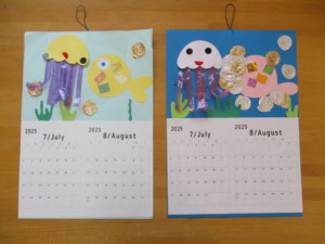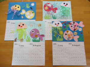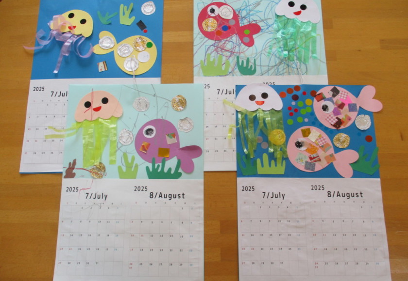 2025年6月23日 7・8月のカレンダー製作 今日は支援室で 7・8月のカレンダーを作りました。 お魚やくらげが泳いでいる 涼し気なカレンダーを作ったよ🐟️ のりをつけてペッタン… 貼ることがすきなおともだち、 クレパスでぐ~るぐる… お絵かきがすきなおともだち、 色を選んだり並べたり… シールあそびがすきなおともだち、 それぞれ好きな活動をがんばって、 素敵なカレンダーができあがりました✨️✨️ 本日もご参加頂きまして ありがとうございました。 また遊びに来てくださいね。 Tweet Share