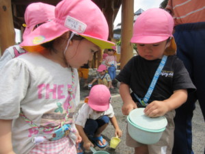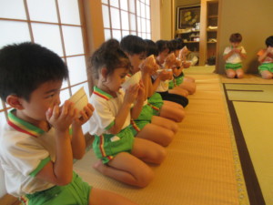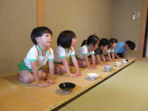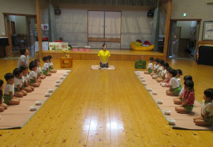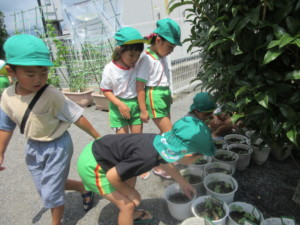 2025年7月15日 おいしいお抹茶うれしいね☺ 遊戯室をお抹茶室に変身させて 「お抹茶室をつかわせてくださいね」 みんなでご挨拶をするよ(^^♪ 「ささのはがあります!」 「きいろのせんがあります♪」と お運びさんは夏茶碗に どんな模様が描かれているのか みんなにお話します✨ みどりさんの 「あさがお」が芽を出したよ🌱 おおきくなぁれ~☆ ももさんカエル発見😲 お鍋やバケツをお家にして 観察スタート🐸 Tweet Share