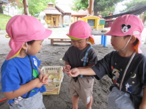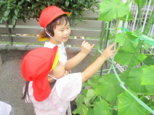 2025年7月18日 ハロー、サム先生! サム先生とハローワクワクをしたよ☺️ 動物の英語を教わりました。 隠れているのはなんだか分かるかな? ハンカチ落としのルールでゲームをしました。 「ジラフ、ジラフ、タイガー!」 「タイガー」と言われたら追いかけるよ☺️ 「bear🧸」真似っ子してリピートしました。 おもしろいね! ももさん、園庭遊びができました。 雨上がりは色々なものが発見できます。 拾って集めておもしろいね☺️ きゅうりの赤ちゃんが少し大きくなっていました。 かわいい~🥒 Tweet Share