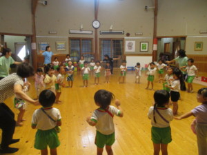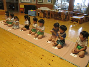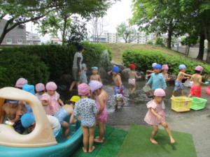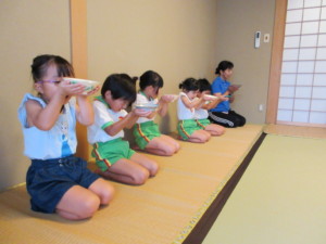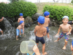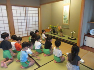 2025年7月8日 夏茶碗でいただくお抹茶おいしいね♡ おまんじゅうを一口サイズに 割っていただくよ。 笹やスイカの描かれた 背の低い夏茶碗🍉✨️ お運びさんの 「おあがりください」のご挨拶で みんながいただくよ 床の間には 「グラジオラス」がお嫁に来たよ✰ 池田こども園では 「ドレミのお花」というニックネームがあり ドレミファソラシド~♬ お抹茶室からみんなの声が聞こえるよ あかさんときさんで 水遊び前の盆踊り♪ じゃぶじゃぶ池での水遊び💧 太陽が雲から顔を出し いいお天気になったよ🌤️ バケツを使って、ばしゃ~ 冷たい水がきもちよかったね(^o^) Tweet Share