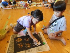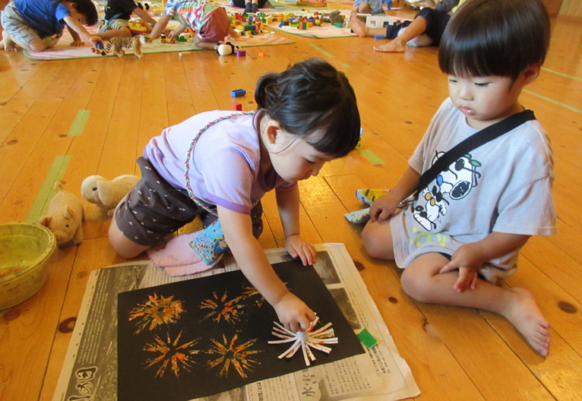 2025年7月24日 太陽さんギラギラだったけどプール遊び気持ちよかったね✨ もりもり食べよう木曜日🍚 今日もカンカン照りで暑かったね☀️💦 そんな時はプール遊びでクールダウン☆彡 おててでパシャパシャ水をかけあいっこ♬ 顔にかかってもへっちゃらで楽しめたね☺️ バタバタバタ…!!! バタ足上手だね✨️ 身体にもしぶきがかかって気持ちいいね♡ ワニさんに変身してプールの中をお散歩♪ 身体全部が水に浸かってひんやりいい気持ち✰ 花火がどーん🎆 トイレットペーパーの芯がスタンプに大変身★ 夜空にたくさん花火が上がって素敵だね🎇 Tweet Share