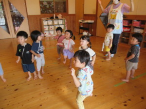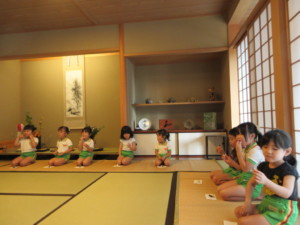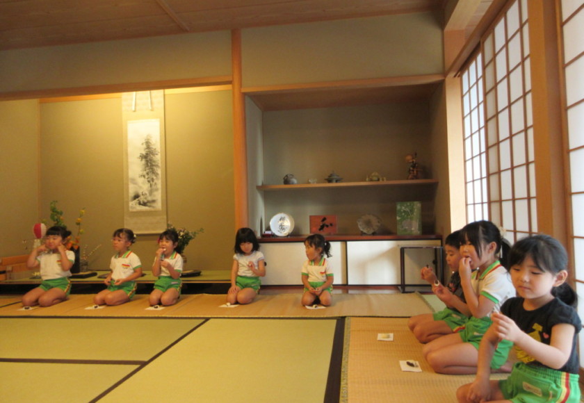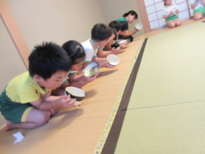 2025年8月5日 8月最初のお抹茶\(^o^)/ 「いただきます」と ご挨拶をして 一口サイズに割ったおまんじゅうを ぱくりっ! 落ち着いた気持ちで おいしくいただけたよ♡ 床の間の掛け軸には 森の中をお散歩する シカさんがいたね🦌 「おみずのみにきたのかな?」と お話する子もいたよ\(^o^)/ ちょうちんの形に似ている 「ホオズキ」がお嫁に来たよ🏮✨️✨️ お運びさんはお抹茶茶碗に どんな模様が描かれているか お話するよ☆ あかさんプール遊び前に 盆踊りで準備体操🩱🩳💧 顔を水につけて ワニさん歩きができる子も! みどりさんになると できることがどんどん増えていくね☺️ ももさんlet’s dance お部屋でも元気いっぱい 身体を動かすよ♬ Tweet Share