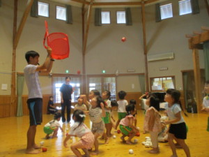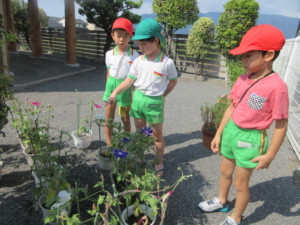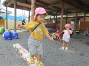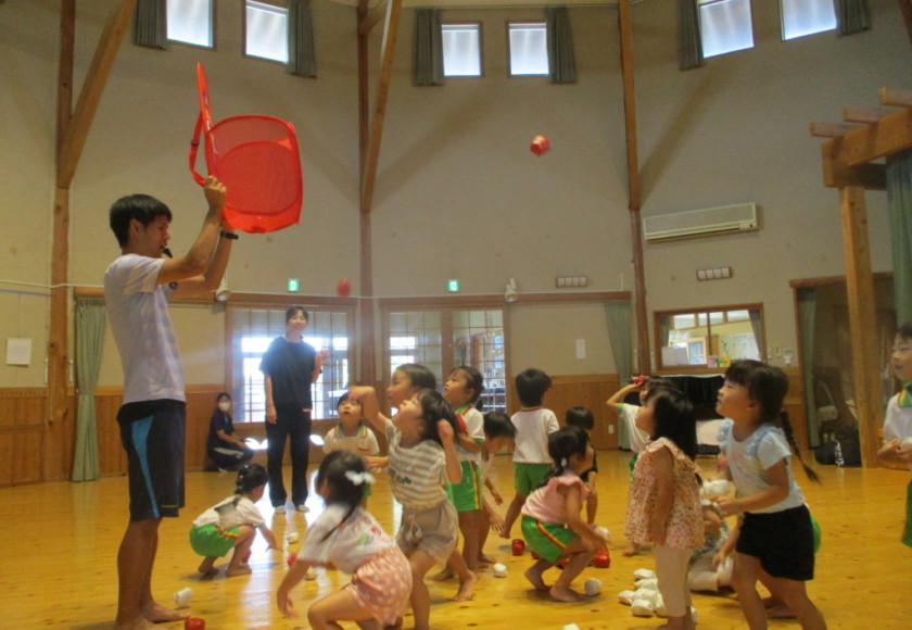 2025年9月8日 元気いっぱい!体育あそび☆ げんきだ はだかだ げつようび 松村先生と体育あそびをしたよ。 玉入れをしたよ!「それーっ」と上に投げるのが 上手だね✨️かごの中に玉は入ったかな? 何度も拾ってする姿が素敵だね♡ 「えいえいおー!!」チームで掛け声をしてスタートです。 たくさんのマーカーを立てるチームと ひっくり返すチームとに分かれてするよ。 周りをよく見てできる子がたくさんだね。 9月になりましたが、まだまだ暑い日が続きますね。 みどりさんのあさがお、いろんな色のものが たくさん咲き、にっこり笑顔☺ ももさんは一本橋を順番にわたったり、 車を走らせたりして、好きな遊びを見つけて 楽しめたね♡ 明日も元気に遊ぼうね☺ Tweet Share