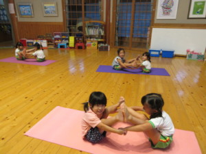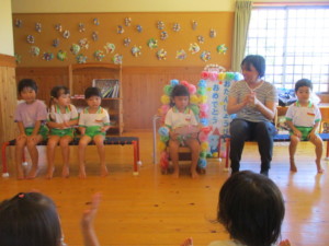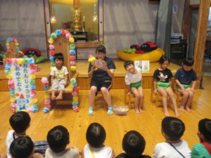 2025年9月3日 楽しいことが盛りだくさんの日! すいすい走ろう水曜日 今日は楽しいことが盛りだくさんの一日でした。 きさんではキッズヨガがありました。 お友だちと手を繋いで 足の裏を合わせて 「せーの!はい!」 とバランスをとりながら船を作りました🚢 色々なポーズがあって楽しかったね☺ 8月と9月に生まれたお友達の お誕生日会がありました。 お誕生日おめでとう!🎉 すくすくと大きくなったね!! 好きな食べ物なんですか? 大きくなったら何になろうかな? 皆にお祝いしてもらえて嬉しかったね☺ プール遊びも明日で最後です。 お水に顔をつけられる時間が長くなって凄いね! 給食の先生手作りのスペシャルおやつ!! ももさんはコーンパン あかさん、きさん、みどりさんは ウインナーパンでした🌭 とても美味しかったね! Tweet Share