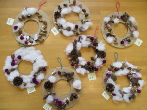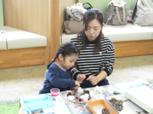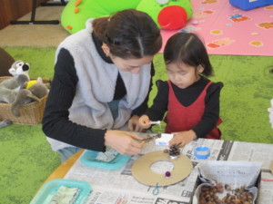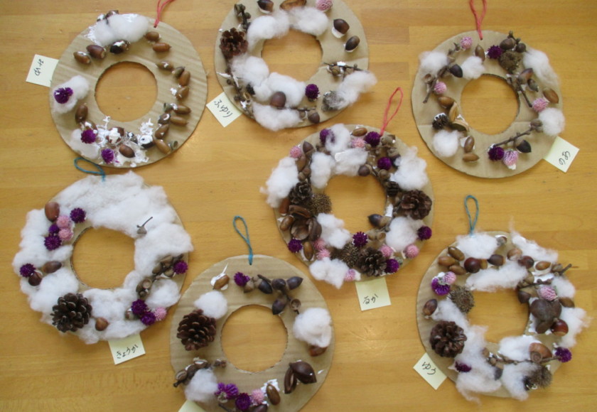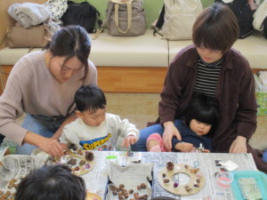 2025年11月5日 木の実であそぼう 今日は支援室で木の実を使って リースをつくりました。 近隣のお宮さんや公園で 木の実を集めました☆☆ どんぐり・まつぼっくり・メタセコイヤなど プリンカップに好きな木の実を集め、 お母さんと一緒に貼りました。 千日草や綿も貼って 素敵なリースができあがりました✨️✨️ 本日もご参加いただきまして ありがとうございました。 また遊びに来てくださいね。 Tweet Share